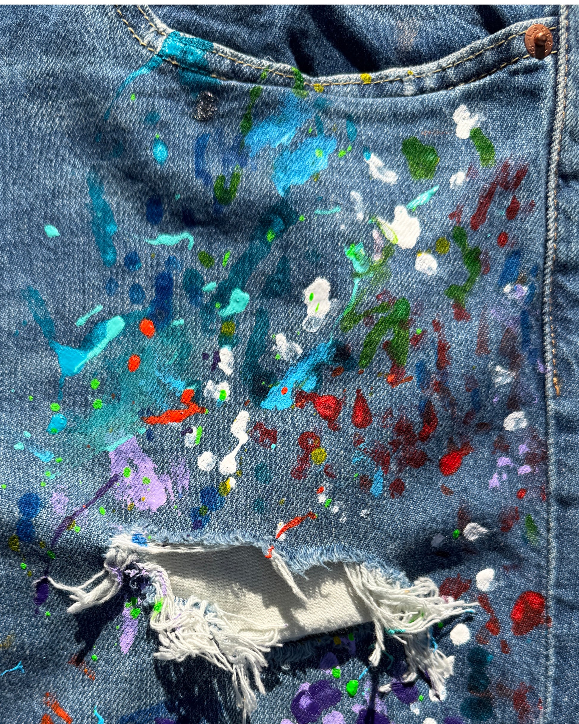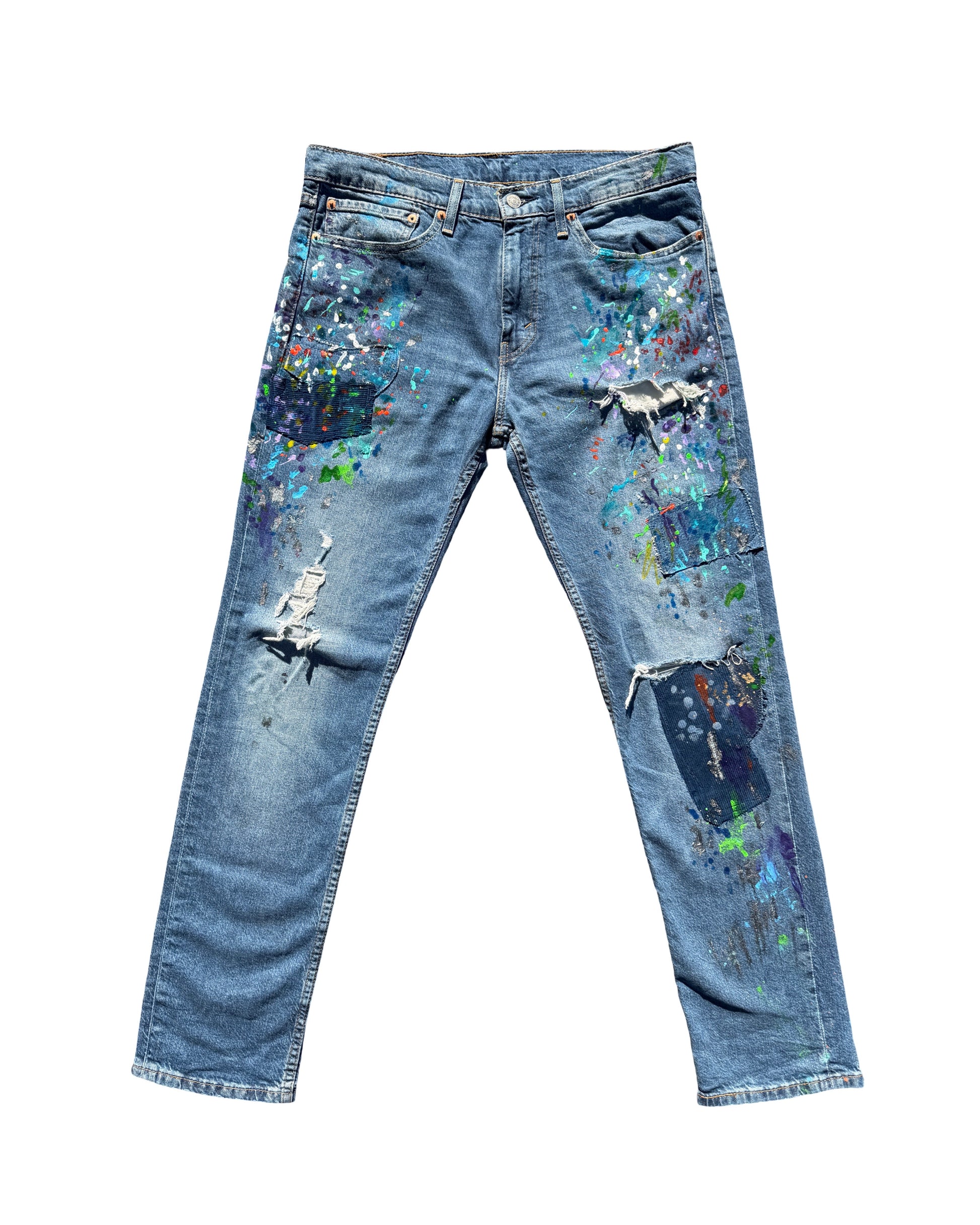 Corduroy patched hand, painted heat set fabric paint magic marker stained 1/1 distressed, vintage Levi’s. 34 W x 32 L