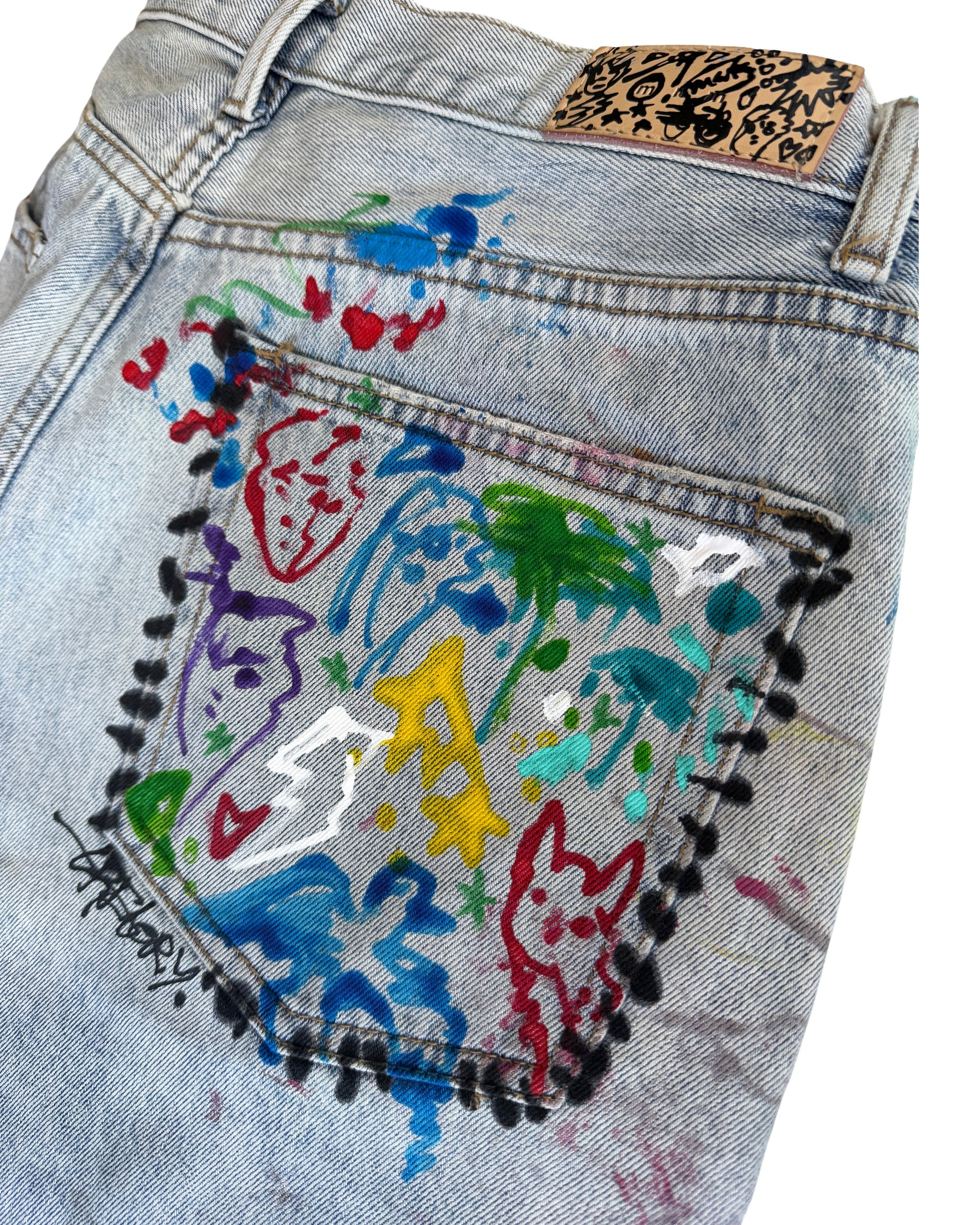 Chain stitched embroidery paint spots, fabric marker and heat set fabric painted 32 W soft baggy vintage Jeans. 1/1 Frame them or Wear them!