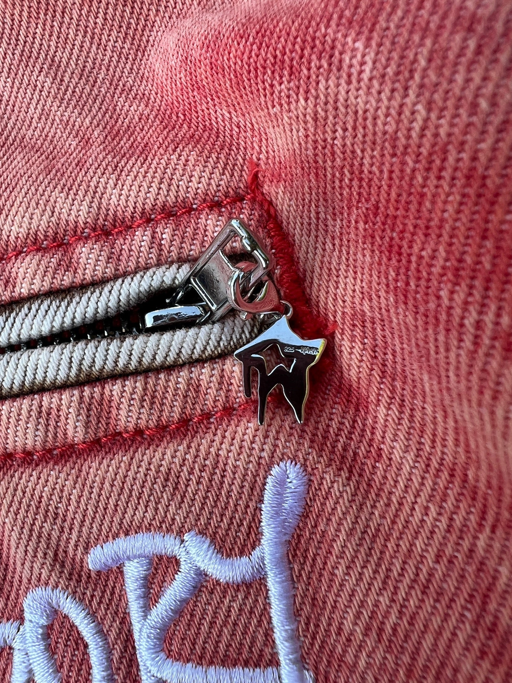 Distressed Denim Work Jacket. Embroidered Front, Screenprinted Back, .925 Sterling Silver Star Drip Zipper. Wear the work.